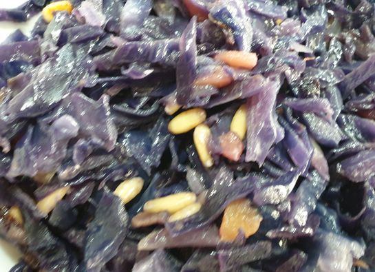 Lombarda con panceta y cebolla caramelizada, piñones, pasas jolie.